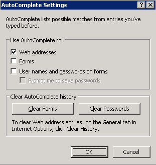 6. Ensure that "Autocomplete" for "Forms" and "User names and passwords on forms" is checked off. Also click on "Clear Passwords" button to remove any existing entries. (See below)